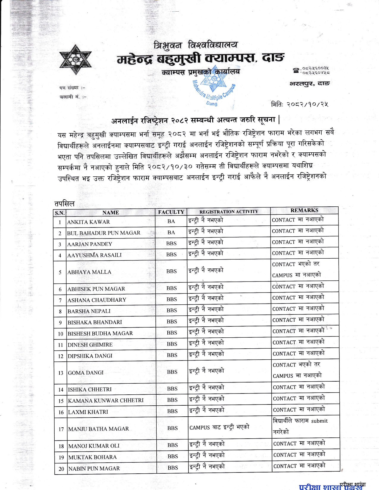अनलाईन रजिष्ट्रेशन २०८२ सम्बन्धी अत्यन्त जरुरी सूचना