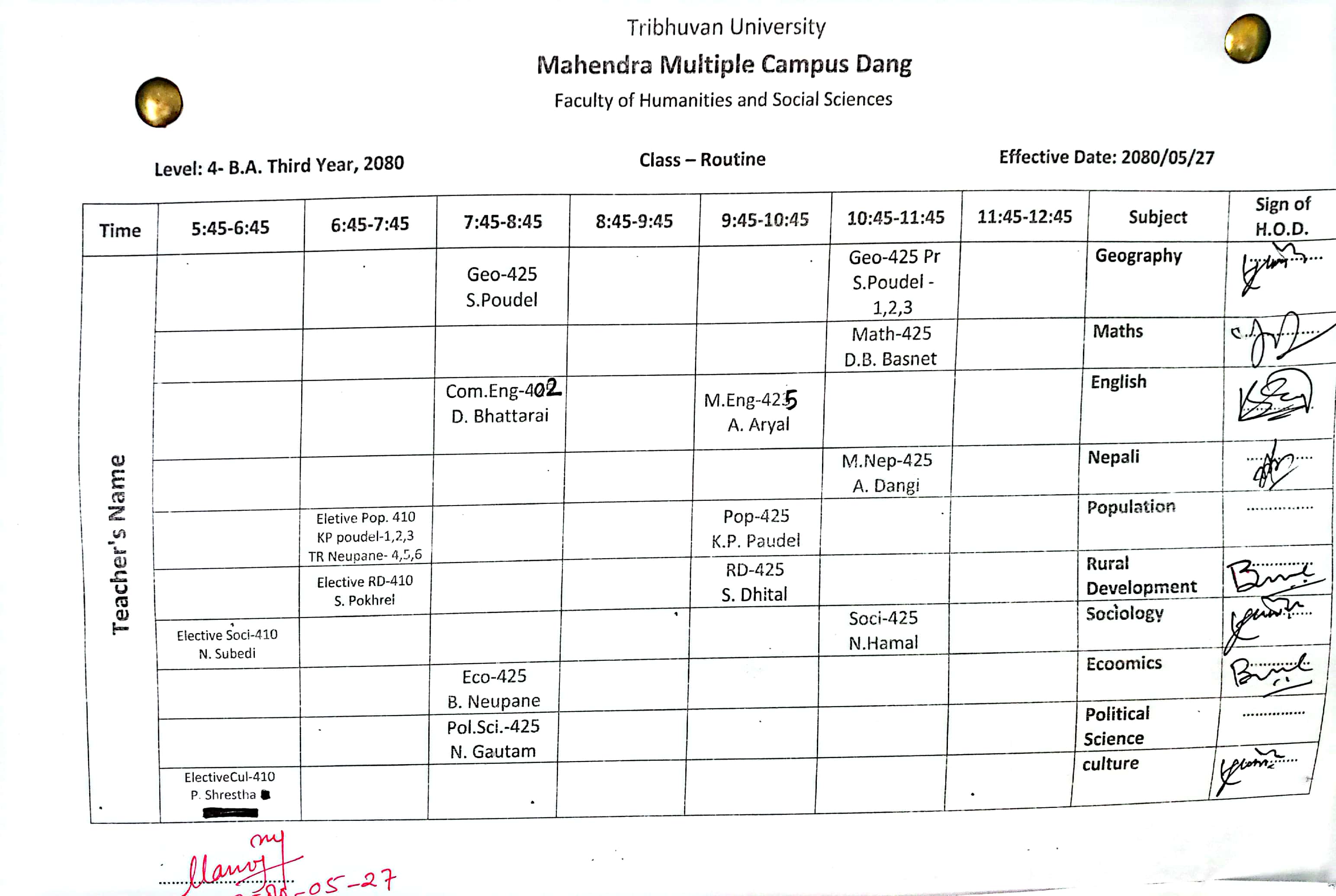4BA Third Year, 2080 Class Routine