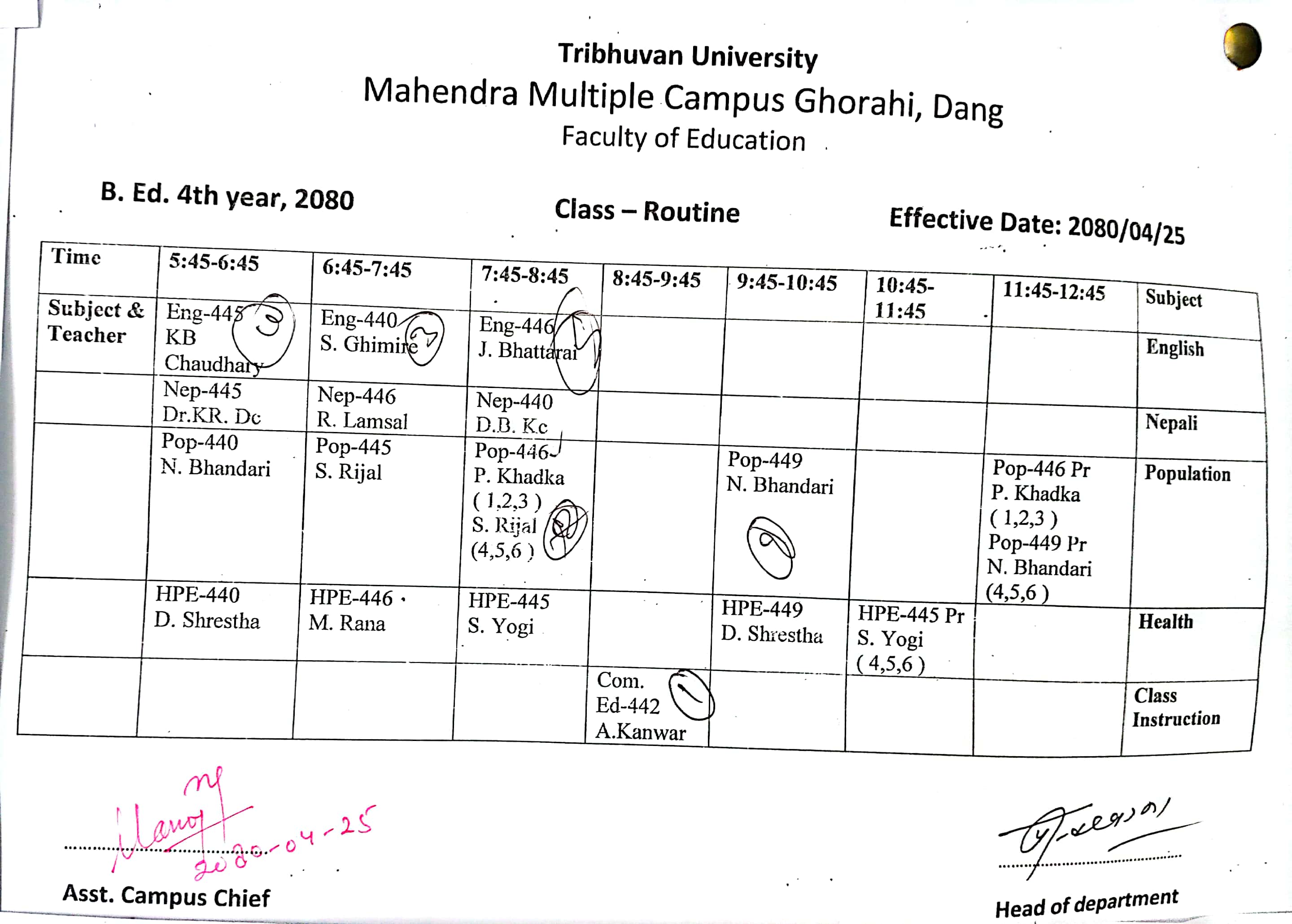 4B.ED. Fourth Year, 2080 Class Routine