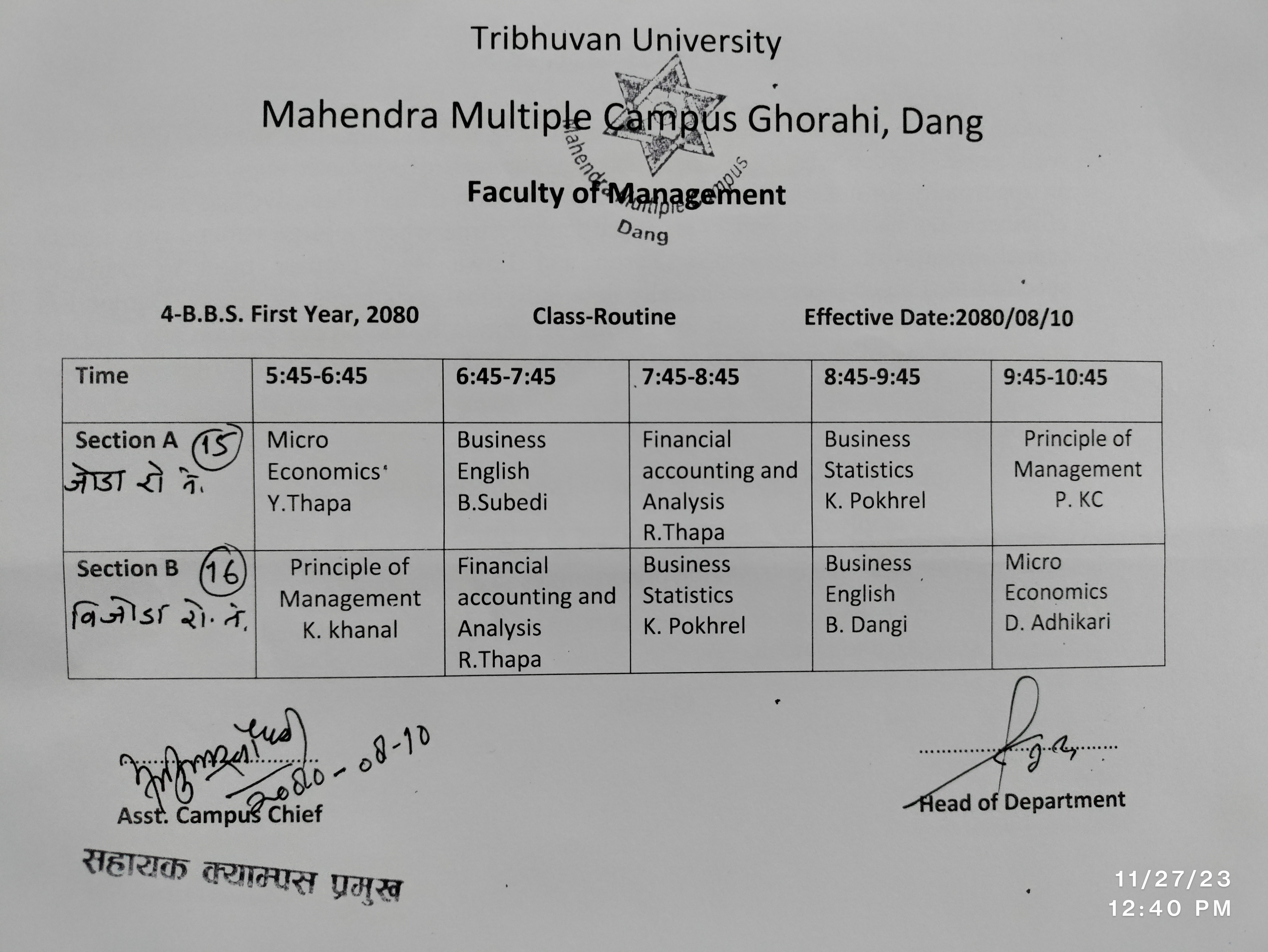 4BBS First year 2080 Class Routine
